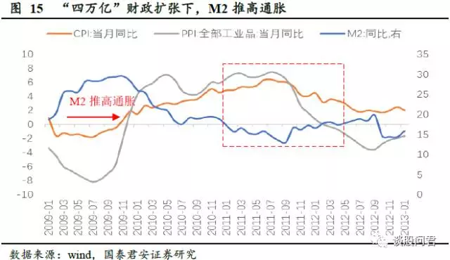 第三次通胀周期从2009 年11 月演绎到2012 年下半年,期间CPI 从2009 年11 月的+0.5%,上行到最高点2011 年7 月的+6.7%,2012 年10 月跌回+1.6%。这轮周期消费需求始终保持稳定,推动通胀的主要动力是M2和信贷。