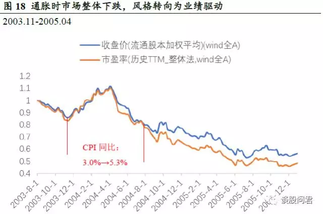 上表点击可以查看大图,但仍然略显复杂。不过在华泰的这张表格中,我们可以看到"温和通胀"阶段的股市并非总是上涨,在2009末-2012年的那一轮通胀周期中,温和通胀阶段的wind全A指数(代表全部A股)下跌了足足有22%。