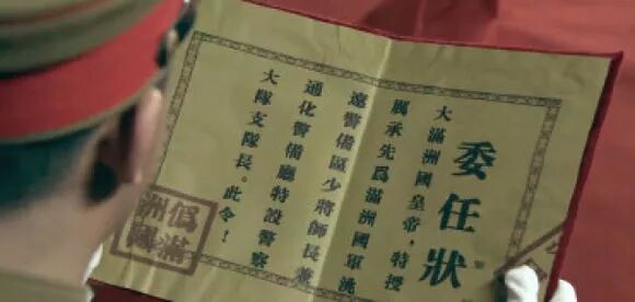 《东北抗日联军》剧照,左下角印章是"伪满洲国"