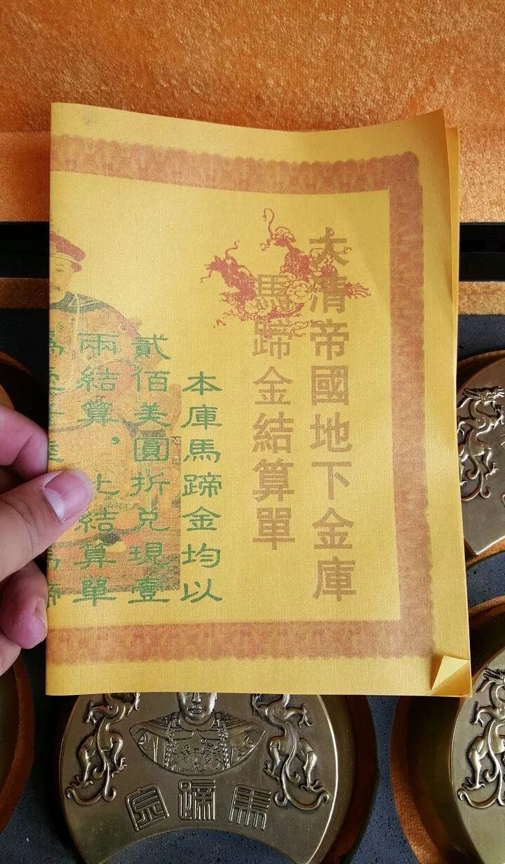 再看看附带的"大清帝国地下金库马蹄金结算单",正文是方正铁筋隶书,还自带标点符号……大概说的是一两马蹄金折兑二百美元。