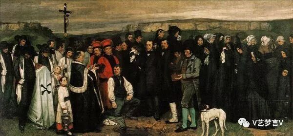 与《画室》齐名的另一幅作品,是《奥尔南的葬礼》。这幅作品也是集结了社会各阶层人士,维持治安者、法官、公证人、教士、市长等等,他们因为"葬礼"这件事而集中在了一起。《奥尔南的葬礼》没有古典主义那种在构图上层层铺垫,将剧情推向高潮的手法,这幅作品几乎就是平铺直叙,所有人一字排开,面无表情却又各怀心事。可见,库尔贝的现实主义是一种质朴、顽强精神的表现,都是对现状,敢于直面,敢于挑战的那份意志。