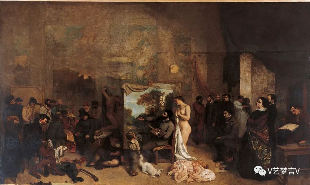库尔贝著名的作品《画室》,其全名应该叫做《画家的工作室——一个现实的寓意,概括了我7年来艺术生活的情况》。画家的立意在于展示画家自己从1848年以来的艺术创作生涯,并寄寓一种意味深远的社会哲理。画家把七年来对自己生活和思想有影响的朋友和他曾经画过的模特集中画在一个画面上,另外,还集中了上流社会各个阶层的形象,呈现了一个较完整的法国社会缩影。这幅高3.95米,宽5.98米的画描绘了30多人,每个人物都有自己的寓意:画面中间是画家自己正在画一幅风景画;画前小孩代表"无邪的眼睛";裸体女模特代表画家心目中的缪斯或真理;画幅背后一个十字架上钉着圣徒塞巴斯蒂安,代表僵死的学院派艺术……整幅画可谓集社会三教九流于一体,隐喻着贫困、忧郁、被损害者、被剥削者等等。
